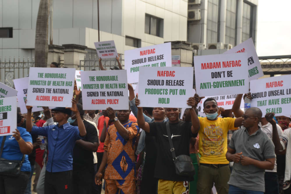 “Dem don already sign the alcohol policy. So, NAFDAC suppose don lift restriction for these factories,” Igein talk.