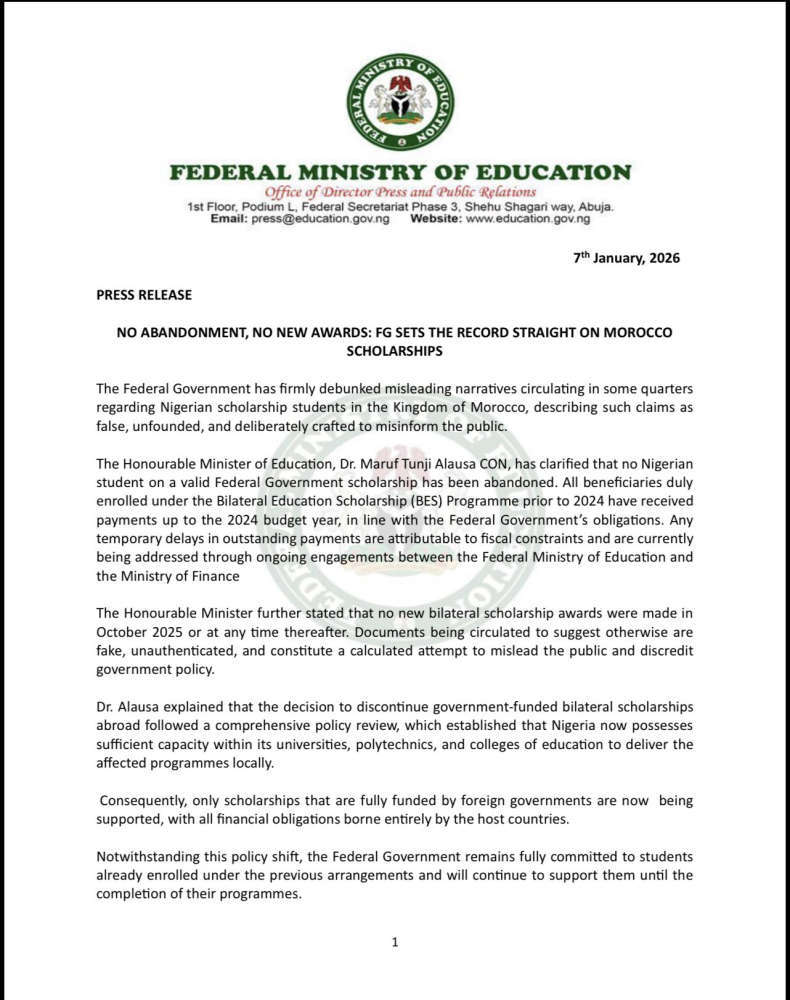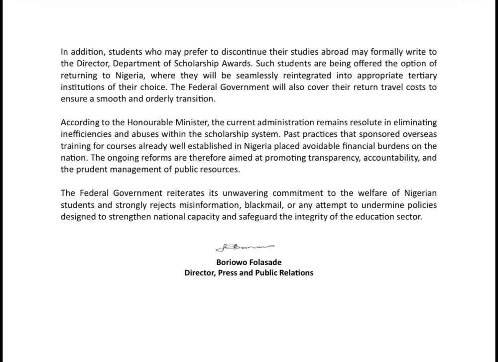The Ministry still assure Nigerians say government go stand by existing scholars until dem graduate, but warn the public make dem avoid fake scholarship offers and documents, especially those circulating for October 2025.